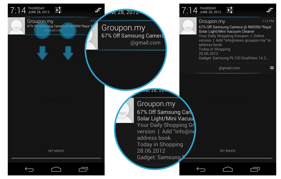 Just got my Galaxy Nexus flashed with the new Android 4.1 (Jelly Bean) Build JRN84D, and I am pretty impressed so far. Most, if not all, of the features showcase during the Google I/O 2012 Day 1 Keynote work just fine, and the Project Butter isn’t just a project name – Jelly Bean is really butter smooth. As I try to explore this new Android, I’ve found some new and interesting changes in terms of UI (definitely not everything, but those are what I managed to find), so I decided to put them all in one post to share my findings.