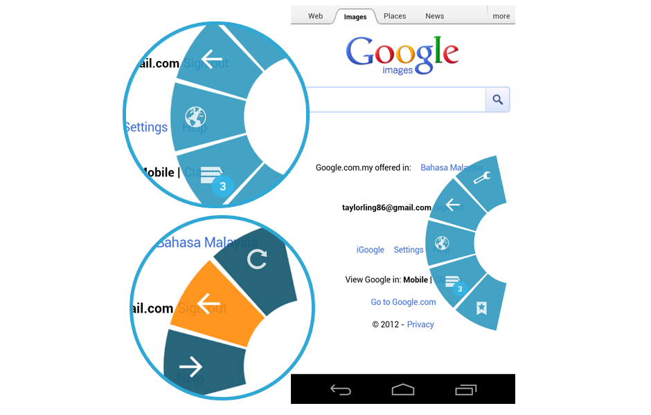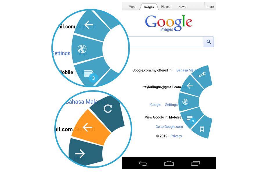 As mentioned previously, I still think Bezel Swipe is a great match with Side Navigation. It is very easy to understand, and bezel swipe isn’t something hard to perform on a mobile device, though I would have to agree that discoverability might be an issue for it. Another reason that I think Bezel Swipe should be there – most of the apps that have Side Navigation, for example Google+ and YouTube, allow the user to touch and hold the main activity and swipe-closing the Side Navigation (try to hold the main activity and swipe to left side), and this user-perceived closing animation can introduce the user expectation of swipe-right-to-reveal gesture for Side Navigation. Try Dolphin Browser HD and Prixing, I think it is completely make sense.