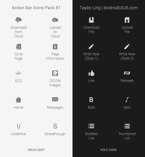 Previously I have published the Action Bar Icon Design Photoshop Template which can be used as a design template for Action Bar icons and export it for all screen densities. Creating an icon, sometimes, is a pretty enjoyable experience – thus, I have used the design template to create 20 Action Bar Icons over the weekend (preview below) which have both Holo Dark and Holo Light version, as well as for all screen densities. The icons for xhdpi screen density are ready to be used in the Android ICS/JB Photoshop GUI Design Kit 3.0.