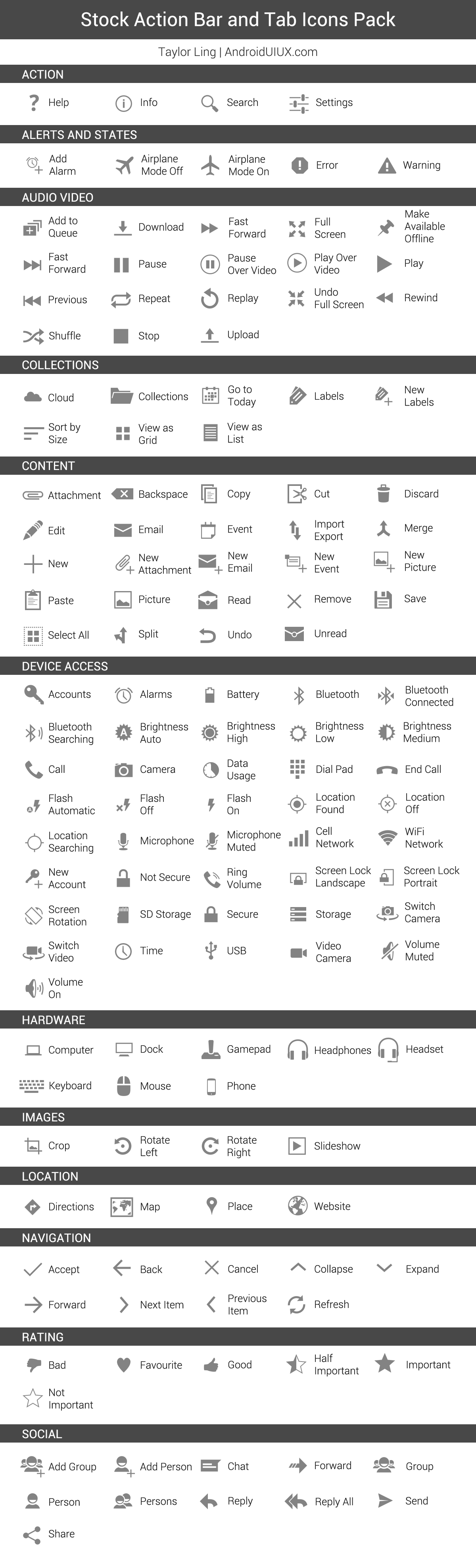 More Action Bar Icons are in the draft stage and will be included in the subsequent icon pack. If you are looking for more professional Android icons, check out the awesome Android Developer Icons 2 at androidicons.com.