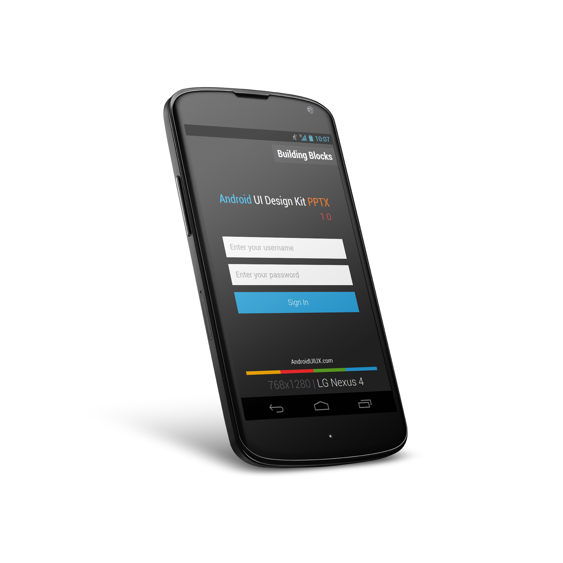 This PPTX Design Kit is made with the specific dimension at 96dpi, when you export the screens to a .png file, it will be exported at the resolution of 768×1280 – the resolution of Nexus 4 screen. You can then frame the exported png file at the Device Art Generator and you are ready to impress people with your design!