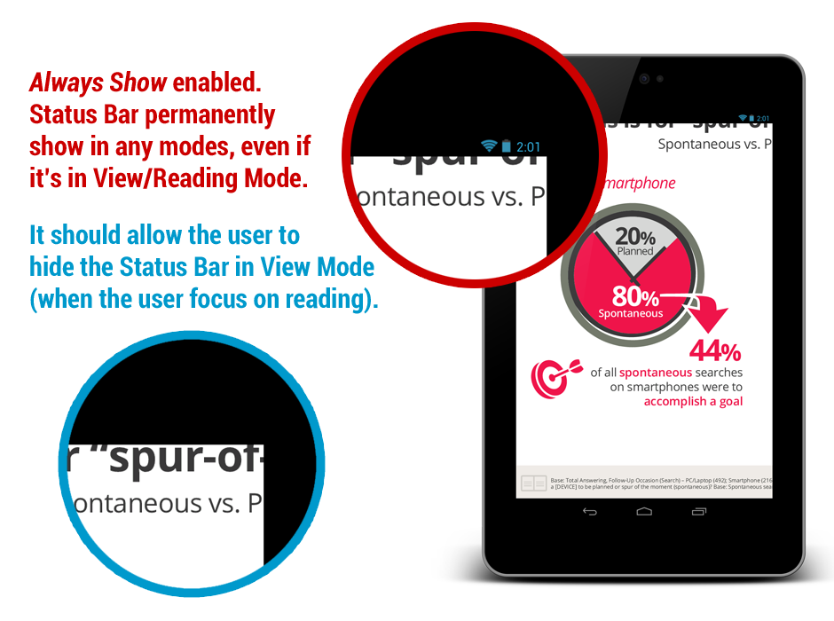 Let’s take RepliGo Reader as the first example. The app is actually pretty good in terms of features and UI, but I didn’t quite like the way it handles the Status Bar. It only allows the user to choose between Always Hide or Always Show option during Reading Mode, which is kind of limited. If they can also include a Show/Hide Together with Other Controls option, then it will be a pretty great user experience, and this should be the default behavior. Look at Google Play Books app, it handles the Status Bar nicely.