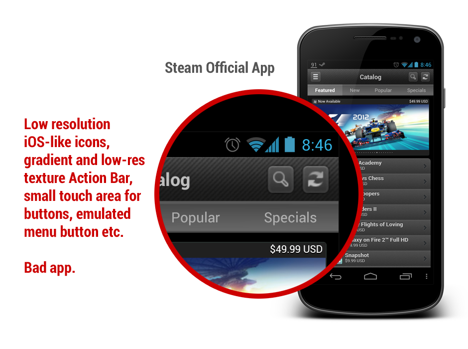 It wasn’t just us Android Designers reject about this, but look at the comments/reviews from the users — they are just going to further strengthen something we are always talked about — users are rejecting Android app with iOS porting, especially when the UI/UX is almost a blatant copy of the iOS version. Further more with this UI, it doesn’t looks too fitting on the iOS 7 which has been refreshed with flat UI design too — probably the designers in the team doesn’t work hard enough.